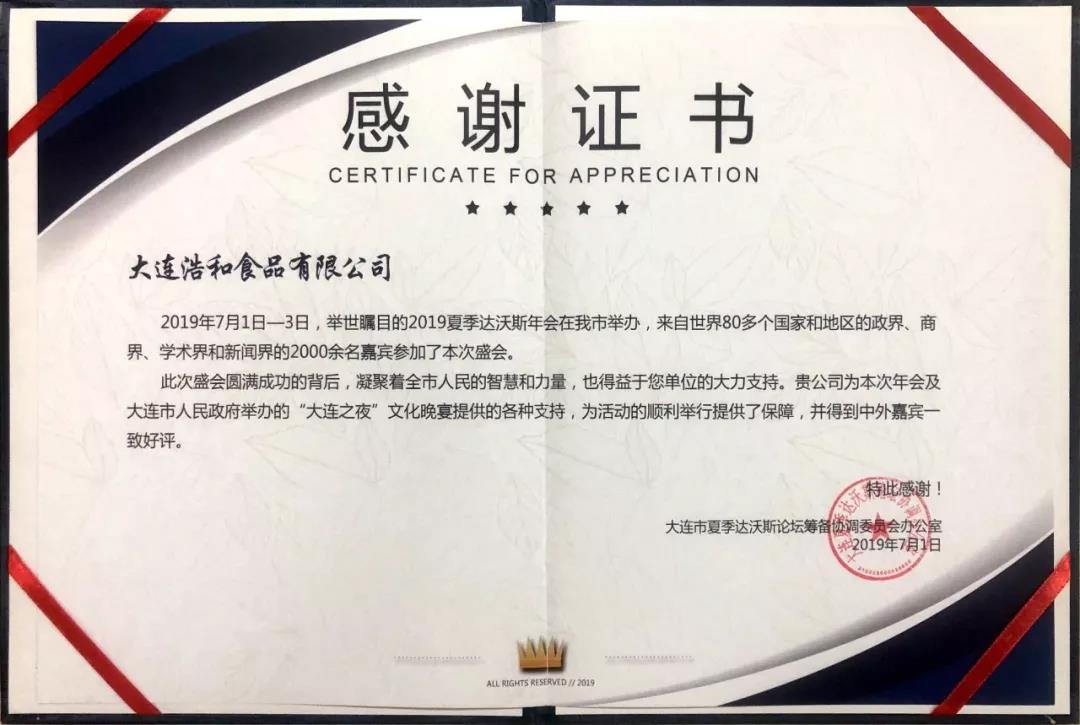 7月1日當(dāng)晚,大連夏季達(dá)沃斯籌備協(xié)調(diào)委員會(huì)向所有為保障此次文化晚宴順利圓滿進(jìn)行而辛苦付出和認(rèn)真籌備的餐飲企業(yè)及贊助企業(yè)表示衷心的感謝,并向相關(guān)企業(yè)頒發(fā)感謝證書(shū),浩和作為此次達(dá)沃斯文化晚宴的優(yōu)秀服務(wù)商和供應(yīng)商,應(yīng)邀上臺(tái)領(lǐng)獎(jiǎng)。