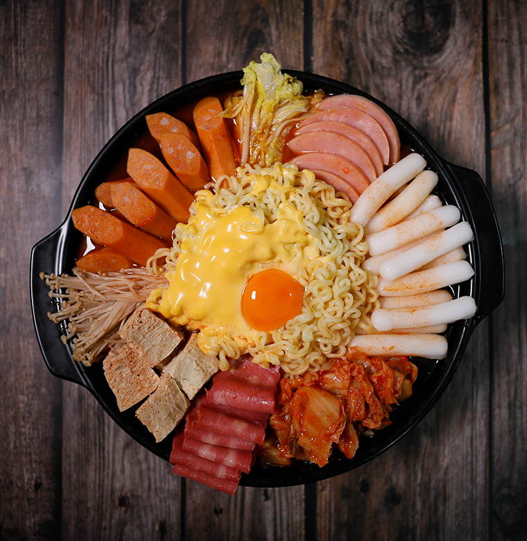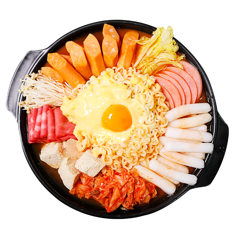 辣白菜、方便面、脆骨腸韓式炒年糕、凍豆腐、午餐肉罐頭、培根肉片、芝士片、辣椒醬、黃豆醬、味淋、味精、牛肉粉調味料、辣椒粉、白砂糖、清酒、食用鹽